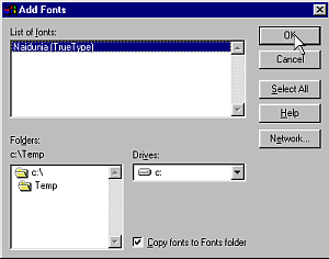 d. It will ask for the directory from where you want to install the new fonts. Just now We have downloaded Naidunia fonts in the directory c:\temp, so give the same path here. As soon as you select the directory where you have saved the fonts, in the top window Naidunia(True Type) appears. Select the Naidunia(True Type) as shown below and click OK button. It will install the Hindi fonts in your system.